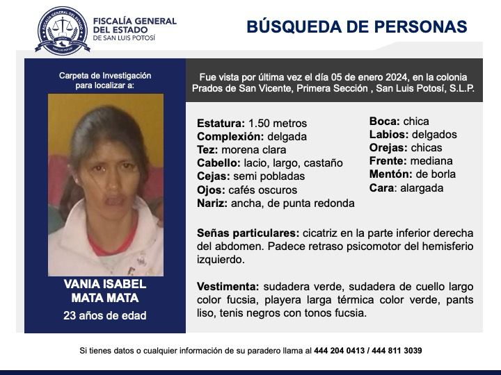 La Fiscalía General del Estado de San Luis Potosí (FGESLP) generó una ficha de búsqueda para localizar a Vania Isabel Mata Mata, una mujer de 23 años de edad buscada en la ciudad Capital.