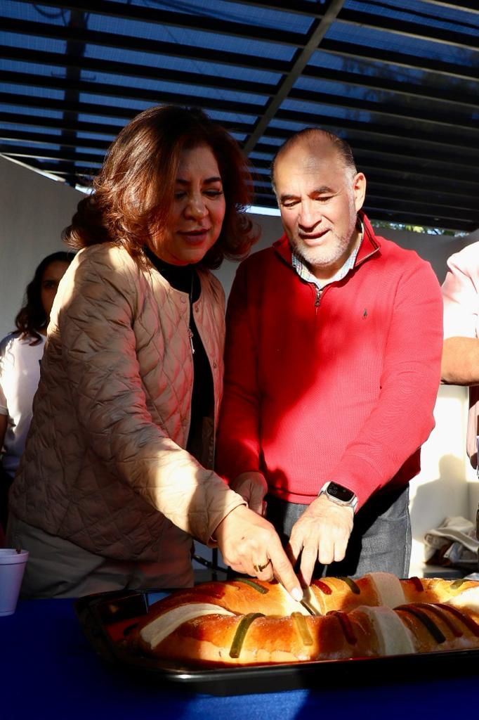 Por su parte, el Presidente Municipal Enrique Galindo Ceballos, hizo un recuento con las y los asistentes sobre el significado de los elementos que contiene la rosca, como lo son, el anillo, el dedal y el Niño Dios.