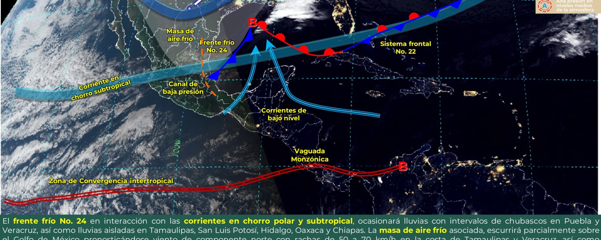 Intervalos de chubascos con lluvias puntuales fuertes (25 a 50 mm): Puebla y Veracruz.