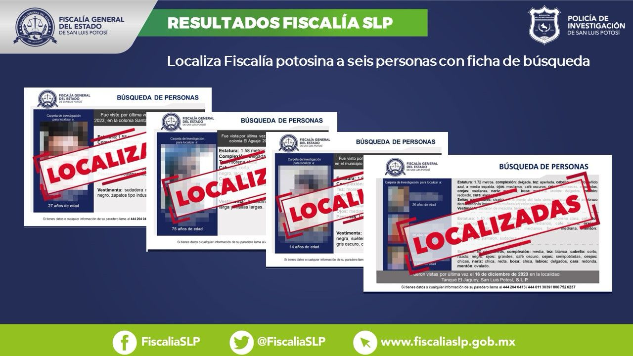 Durante el primer fin de semana del mes de enero de 2024, la Fiscalía General del Estado de San Luis Potosí (FGESLP) ubicó a seis personas que eran buscadas en territorio potosino.
