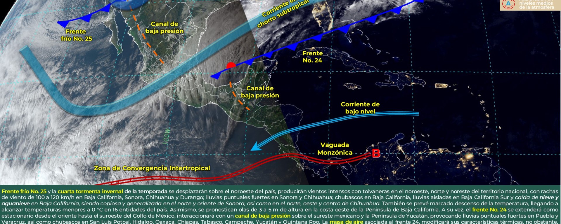 Oleaje de 2 a 3 metros de altura: costa oeste de Baja California y Baja California Sur, así como en el litoral de Jalisco y Tamaulipas.
