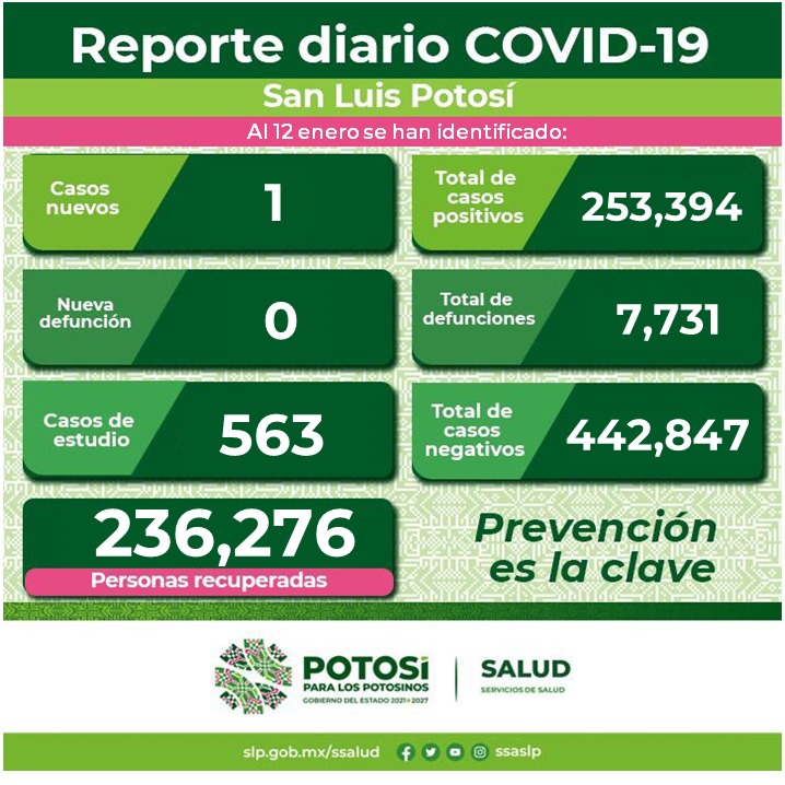 El nuevo caso se detectó en la Jurisdicción Sanitaria I, perteneciente a la capital; en las jurisdicciones sanitarias, II de Matehuala, III de Villa de Pozos, IV de Rioverde, V de Ciudad Valles, VI de Tamazunchale y VII de Tancanhuitz no se presentaron casos nuevos ni en personas residentes de otra entidad.