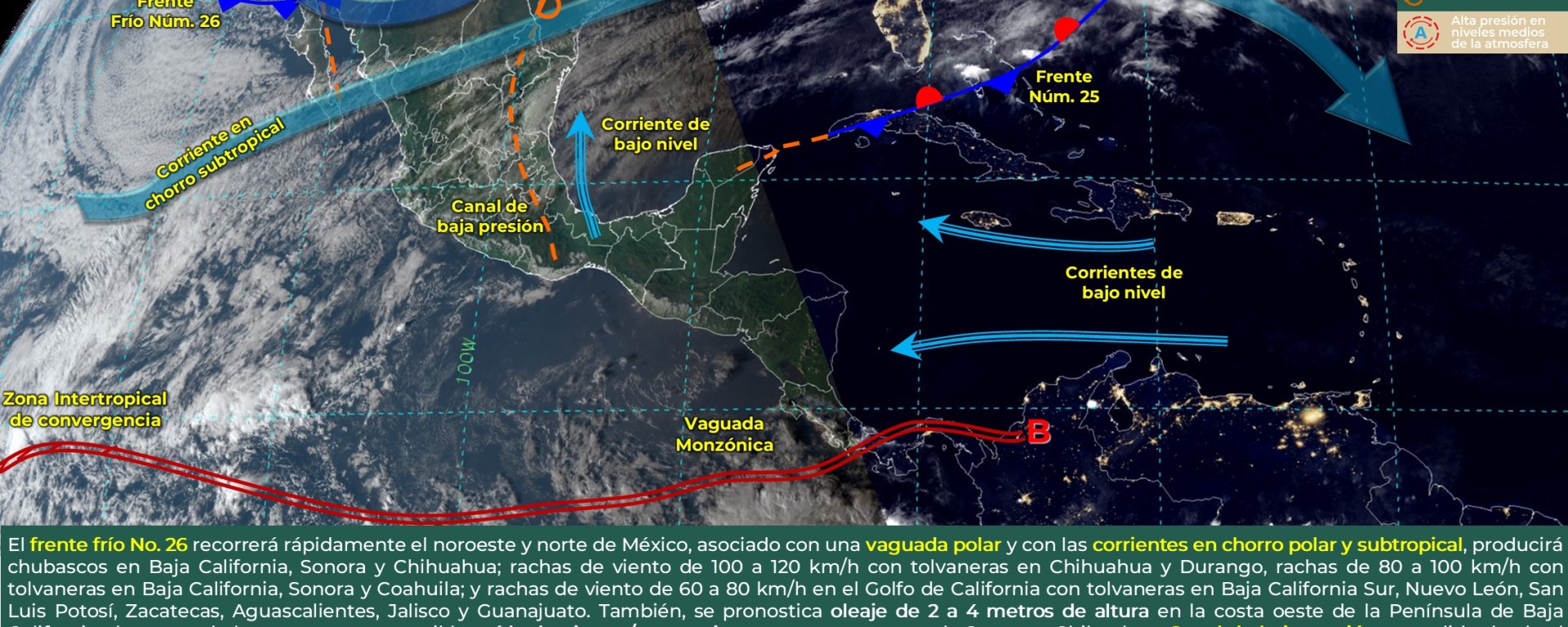 Evento de “Norte” de corta duración con rachas de viento de 80 a 100 km/h y oleaje de 2 a 4 metros de altura: costas de Tamaulipas y Veracruz, extendiéndose durante la noche hacia Tabasco, con rachas de viento de 50 a 60 km/h y oleaje de 1 a 2 metros de altura.