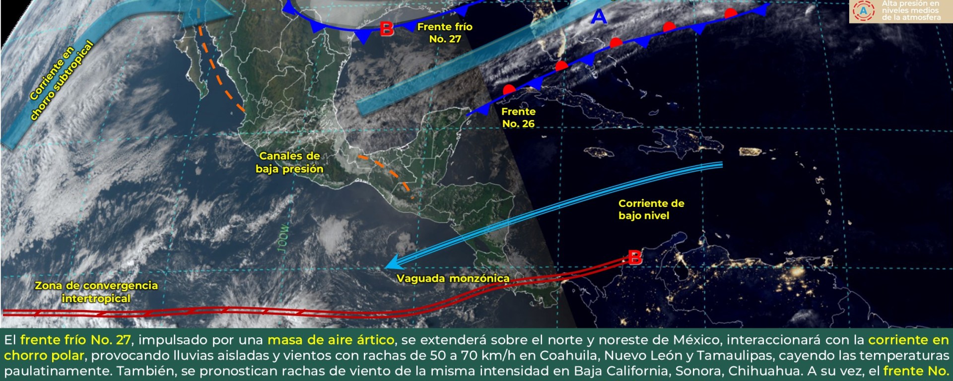 Vientos con rachas de 40 a 60 km/h y tolvaneras: Baja California, Baja California Sur, Sonora, Chihuahua, Coahuila, Nuevo León, Tamaulipas, San Luis Potosí, Zacatecas, Durango, Aguascalientes, Jalisco y Guanajuato.