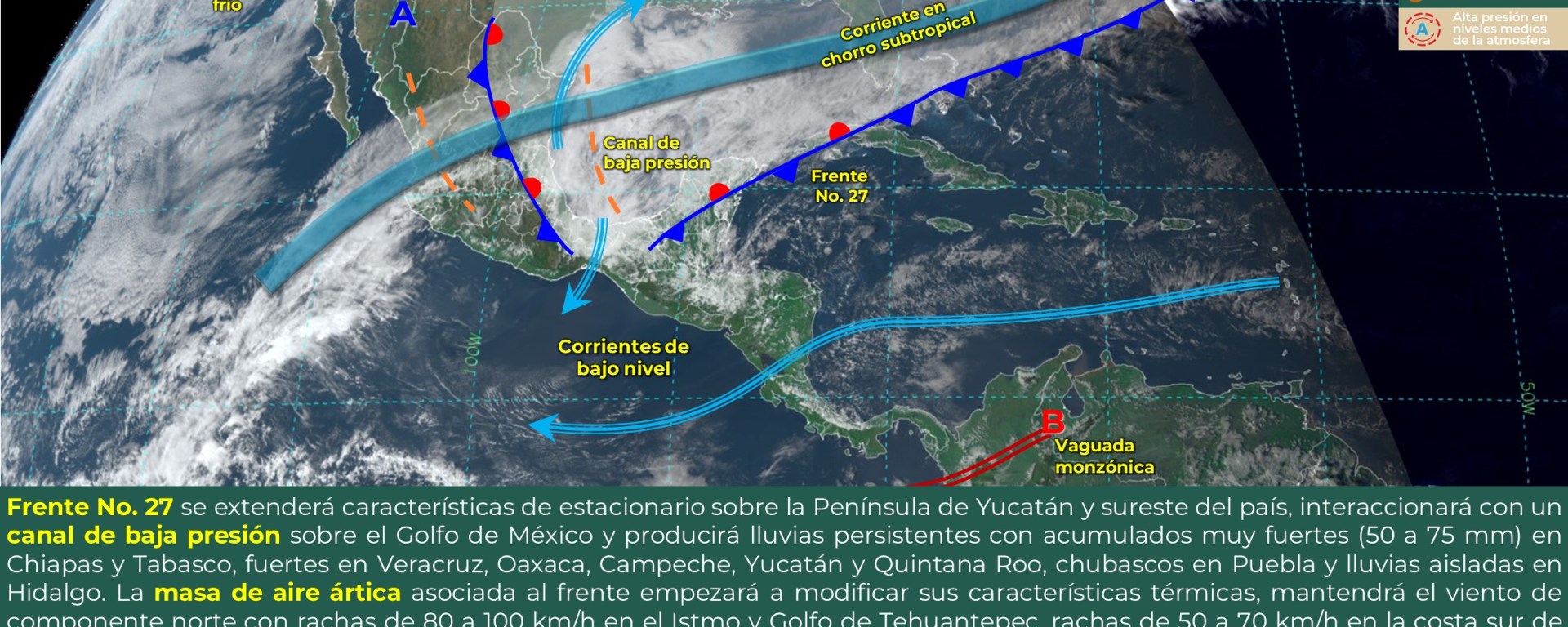 Intervalos de chubascos (5 a 25 mm): Chiapas, Tabasco, Campeche, Yucatán y Quintana Roo.