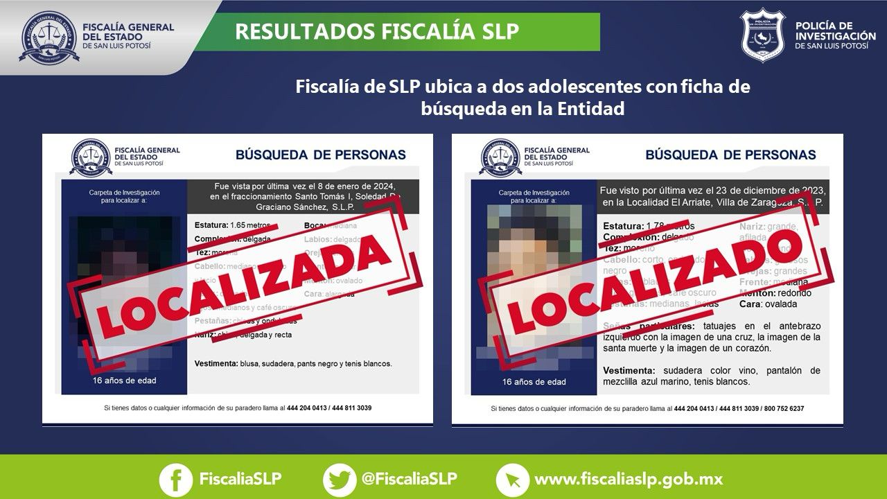 La Fiscalía General del Estado de San Luis Potosí (FGESLP) informó que a través de las acciones de la Policía de Investigación (PDI), consiguió ubicar a dos adolescentes en la Entidad.