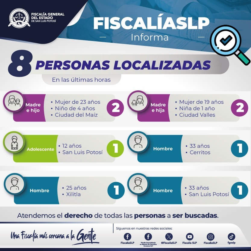 A través de distintas acciones, ocho personas que eran buscadas en territorio potosino fueron encontradas por agentes de la Dirección General de Métodos de Investigación (DGMI), informó la Fiscalía General del Estado de San Luis Potosí (FGESLP).