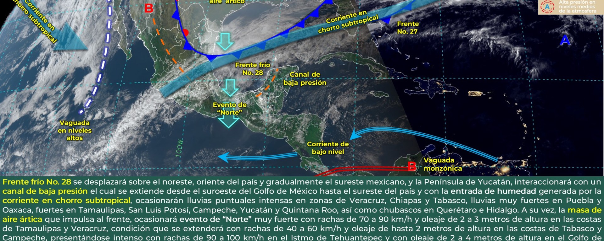 Evento de “Norte” con rachas de viento de 80 a 100 km/h: Istmo de Tehuantepec; con oleaje de 2 a 4 metros de altura: costas de Veracruz y Golfo de Tehuantepec; con rachas de 60 a 80 km/h y oleaje de 2 a 3 metros de altura: costas de Tamaulipas; y con rachas de 40 a 60 km/h y oleaje de 1 a 2 metros de altura: costas de Tabasco, Campeche, Yucatán y Quintana Roo.