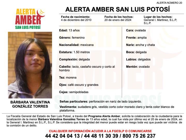 La Fiscalía General del Estado de San Luis Potosí (FGESLP) activó una Alerta Amber para ubicar a Bárbara Valentina González Torres, una adolescente de 13 años de edad.