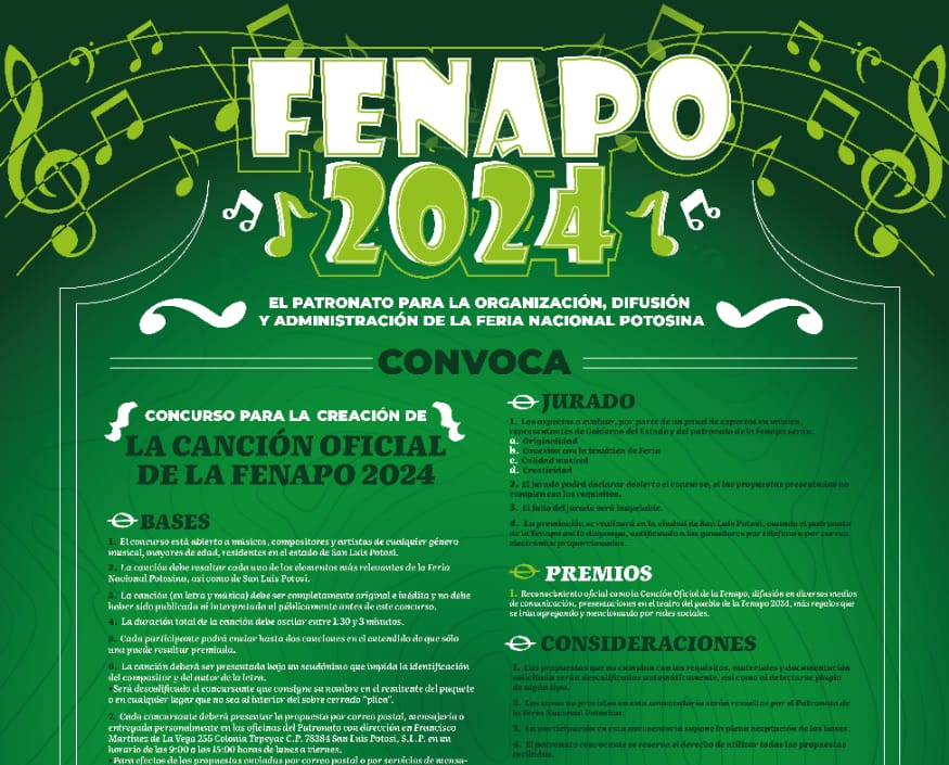 El Gobierno del Estado, a través de la Feria Nacional Potosina (Fenapo), publicó la convocatoria dirigida a artistas y creadores potosinos para crear el tema oficial de la edición 2024 de la gran fiesta de las y los potosinos.