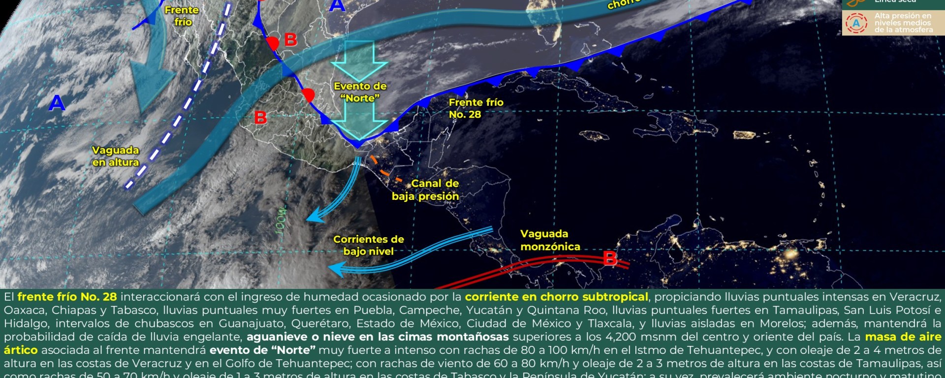 Viento de componente norte con rachas de viento de 60 a 80 km/h: Istmo de Tehuantepec; con oleaje de 1 a 3 metros de altura: Golfo de Tehuantepec y costas de Veracruz, disminuyendo al finalizar el día.