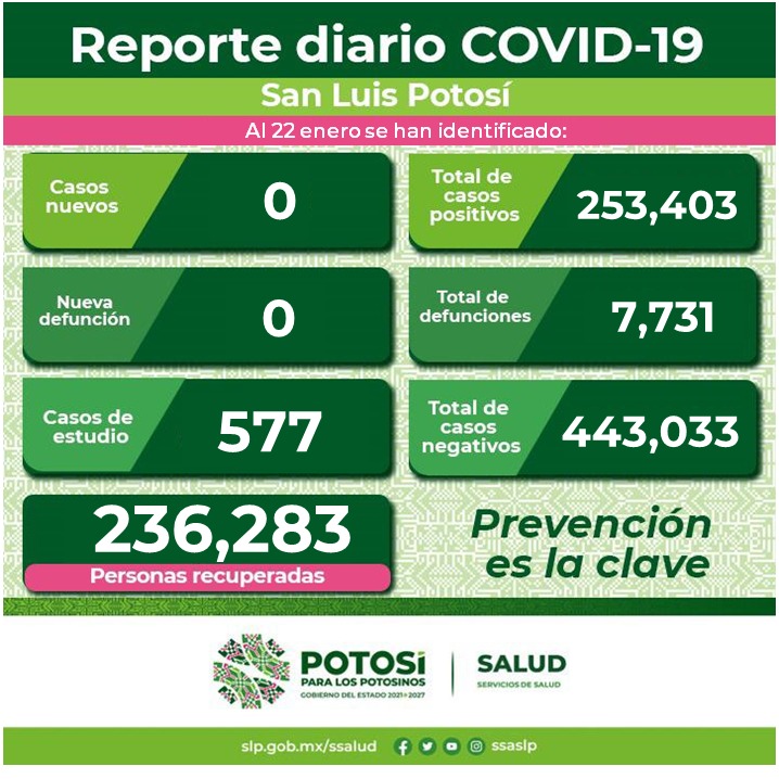 Este 22 de enero no se registran contagios de Covid-19 en el Estado, la ocupación hospitalaria se encuentra al cero por ciento y no hay defunciones; los Servicios de Salud piden a la población en general no bajar la guardia, y recomiendan el uso de cubrebocas si presenta síntomas de enfermedad respiratoria.