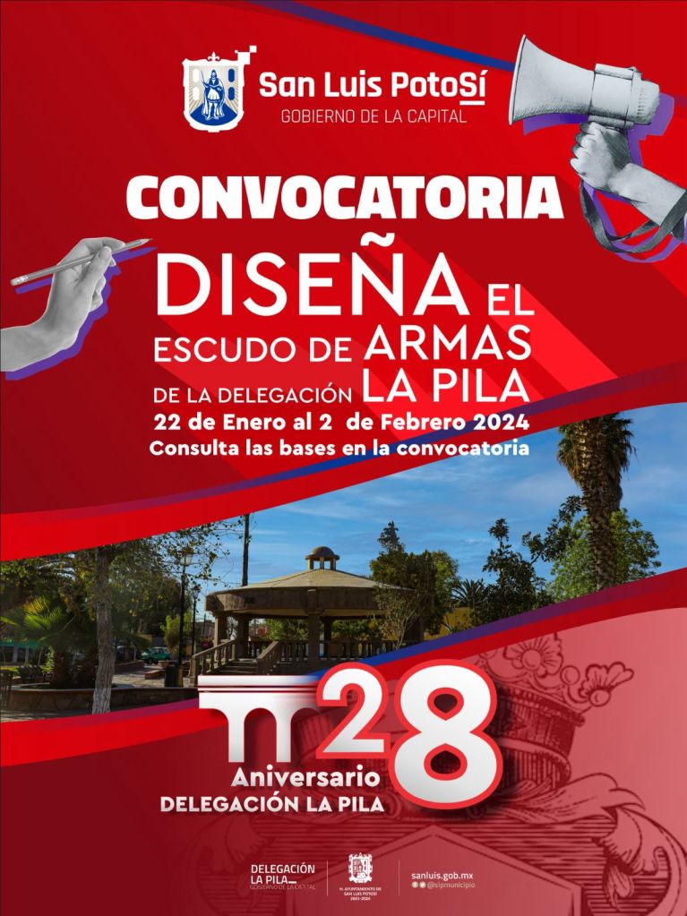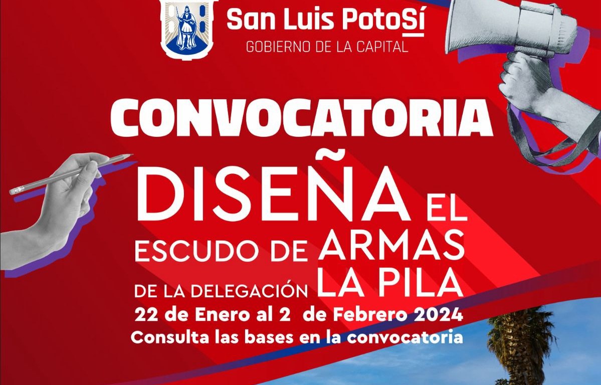 Ya se abrió la convocatoria pública para diseñar el Escudo de la Delegación de La Pila. El Ayuntamiento de San Luis Potosí invita a habitantes de dicha demarcación a participar y hacer su aportación. Se otorgará un premio único a la persona ganadora de 10 mil pesos y al resto, se les entregará un reconocimiento por su participación en el concurso.