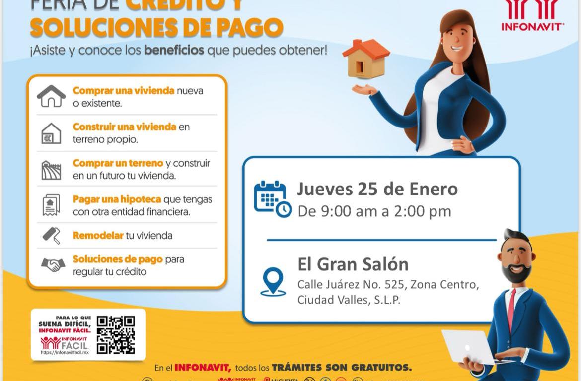 El Instituto del Fondo Nacional de la Vivienda para los Trabajadores (Infonavit) realizará Feria de Crédito y Soluciones de Pago en Ciudad Valles, San Luis Potosí, con el objetivo de que las personas conozcan sus productos financieros y sus diferentes alternativas para ponerse al corriente en el pago de sus mensualidades, en caso de que tengan un financiamiento y enfrenten dificultades para pagarlo.