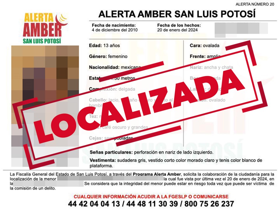 Luego de activar una ficha de Alerta Amber para su ubicación, Bárbara, una adolescente de 13 años, fue encontrada a través de operativos de búsqueda, informó la Fiscalía General del Estado de San Luis Potosí (FGESLP).