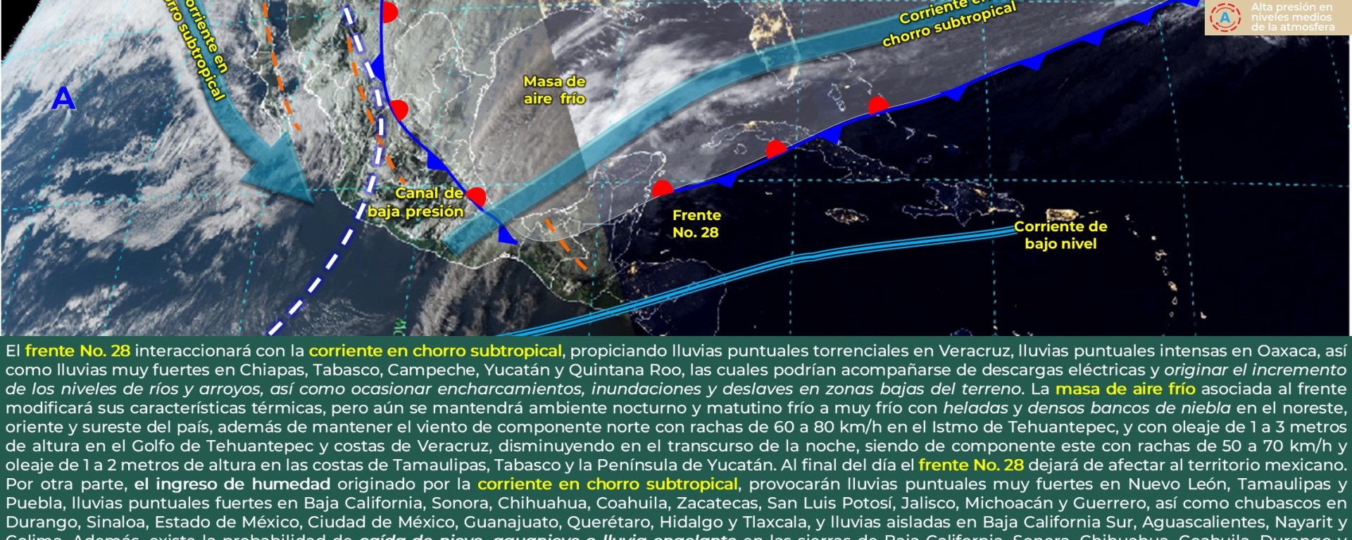 Vientos con rachas de 60 a 80 km/h y tolvaneras: Baja California, Sonora, Chihuahua, Durango, Zacatecas, Coahuila, Nuevo León y San Luis Potosí.