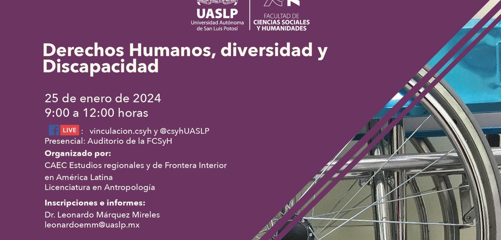 La Universidad Autónoma de San Luis Potosí a través de la Facultad de Ciencias Sociales y Humanidades (FCSYH) y la Licenciatura en Antropología, hacen una atenta invitación a la comunidad universitaria y sociedad en general, para que asistan al evento “Derechos Humanos, Diversidad y Discapacidad”, que tendrá lugar el jueves 25 de enero de 2024, en un horario de 09:00 a 12:00 Hrs. en el Auditorio de la FCSYH y que será transmitido simultáneamente vía Facebook en @Ciencias Sociales y Humanidades UASLP.