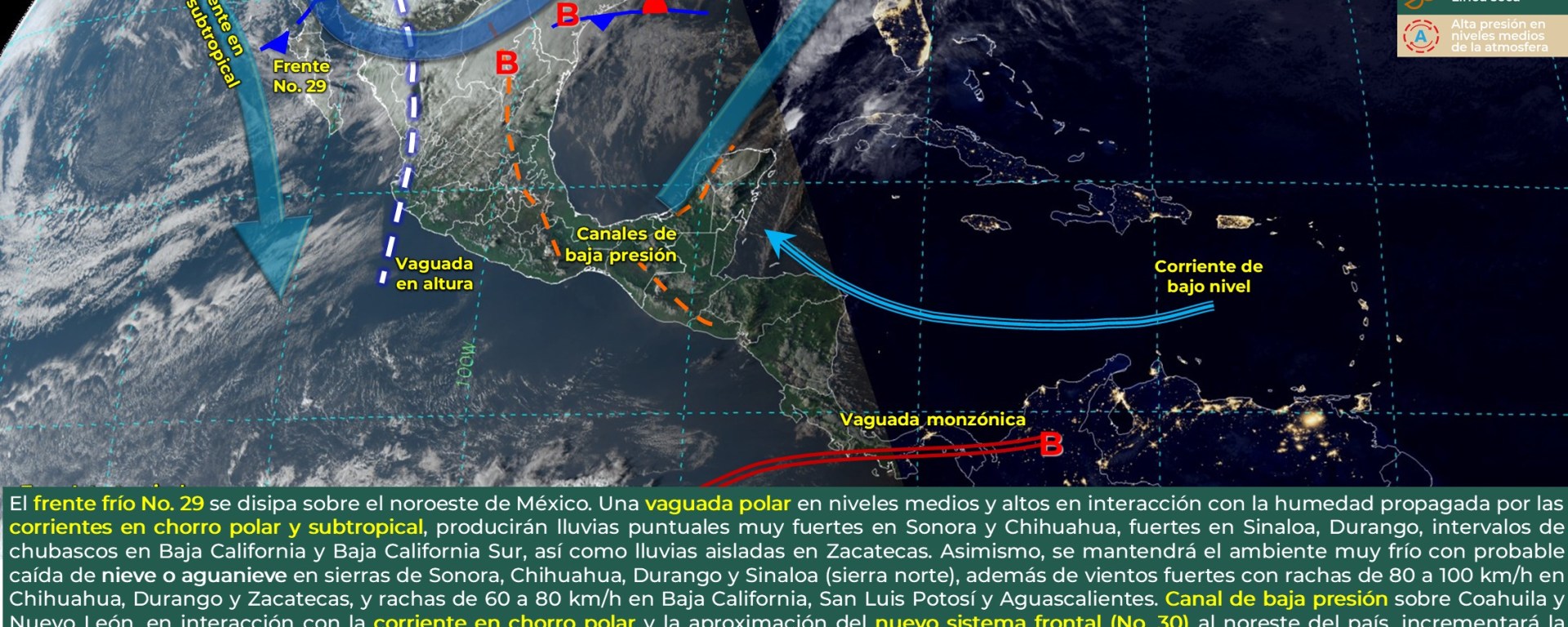 Vientos con rachas de 40 a 60 km/h y posibles tolvaneras: Durango, San Luis Potosí, Zacatecas, Aguascalientes, Nayarit, Jalisco, Guanajuato, Querétaro, Hidalgo, Puebla, Tlaxcala, Estado de México y Ciudad de México, y con posible formación de torbellinos o tornados: Coahuila (noreste), Nuevo León (norte) y Tamaulipas (noroeste y norte), durante la madrugada.