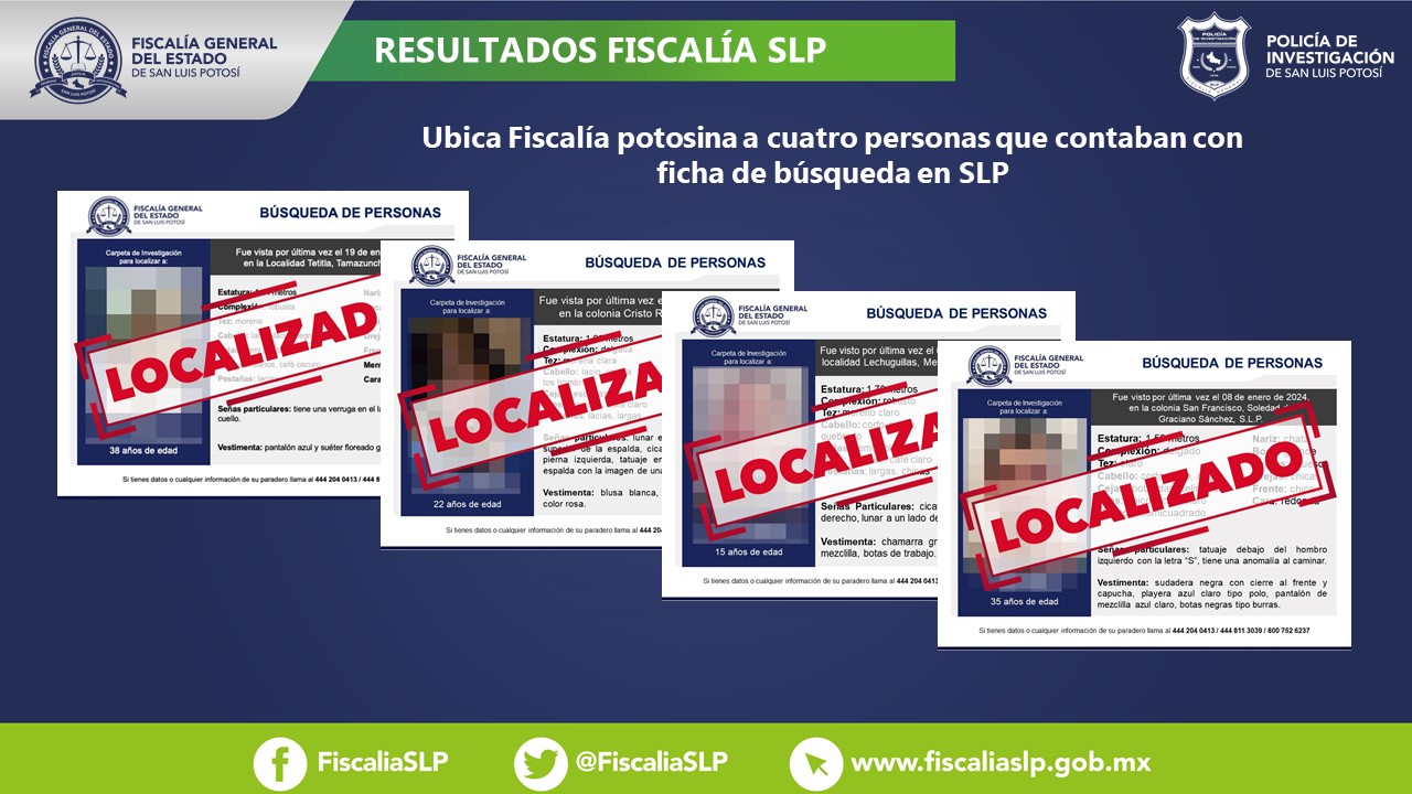 La Fiscalía General del Estado de San Luis Potosí (FGESLP) informa que como resultado de los trabajos que implementó la Dirección General de Métodos de Investigación (DGMI), se ubicó a cuatro personas en la Entidad potosina.