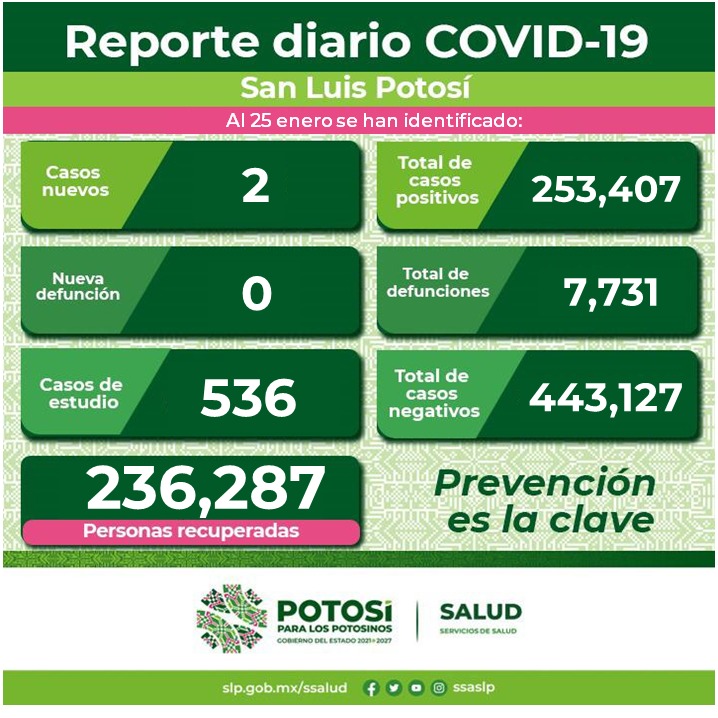 Los nuevos casos se detectaron en la Jurisdicción Sanitaria I, ambos corresponden a la capital; en las jurisdicciones sanitarias, II de Matehuala, III de Villa de Pozos, IV de Rioverde, V de Ciudad Valles, VI de Tamazunchale y VII de Tancanhuitz no se presentaron casos nuevos ni en personas residentes de otra entidad.