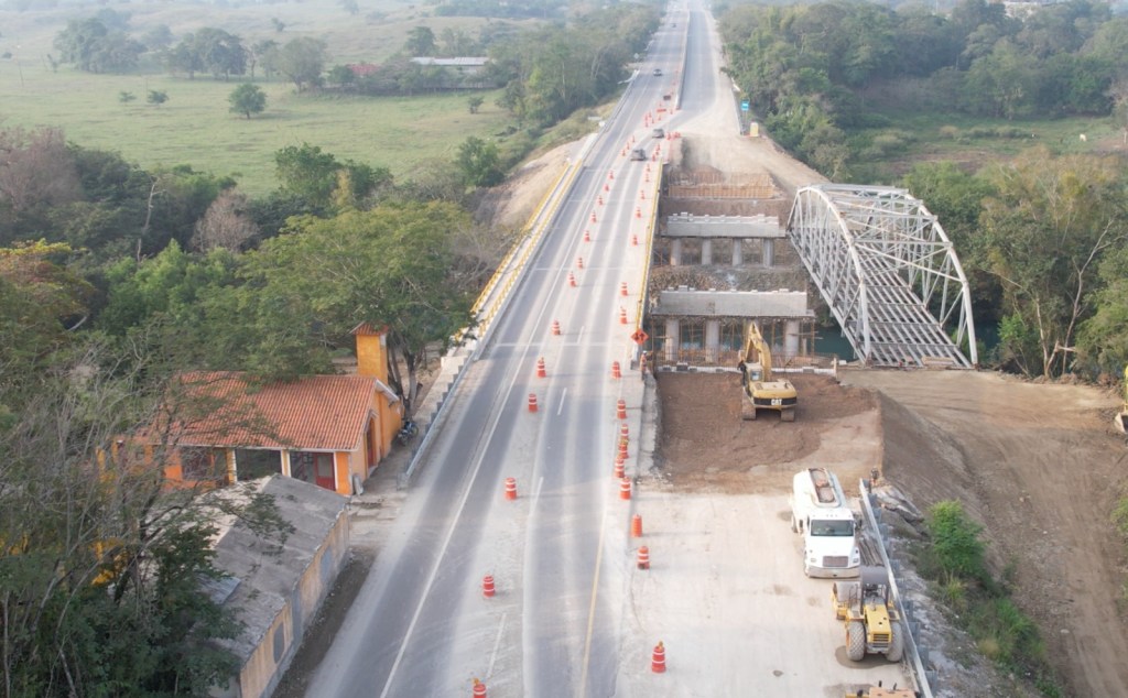 La Secretaría de Infraestructura Comunicaciones y Transportes (SICT) en San Luis Potosí informa sobre el montaje de trabes en el puente Coy, como parte de la modernización de la carretera Ciudad Valles-Tamazunchale.
