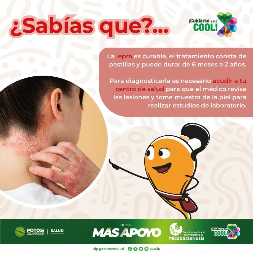 Detalló que este padecimiento daña principalmente la piel, y si no se diagnostica e inicia el tratamiento adecuado y de manera oportuna, puede causar deformidades óseas, discapacidades, lesiones progresivas y permanentes en la piel, los nervios, las extremidades y los ojos. La lepra se caracteriza principalmente por la aparición de manchas descoloridas o café-rojizas en cualquier parte del cuerpo, estas manchas no tienen vello, no sudan y no duelen, si alguna persona presenta estos síntomas, es necesario que acuda de inmediato a su centro de salud. Ahí recibirán valoración, se realizarán los exámenes y pruebas necesarias para confirmar o no Lepra y pueda recibir tratamiento oportuno evitando así complicaciones, la lepra es una enfermedad que aún existe, es curable y el tratamiento es gratuito en los Servicios de Salud