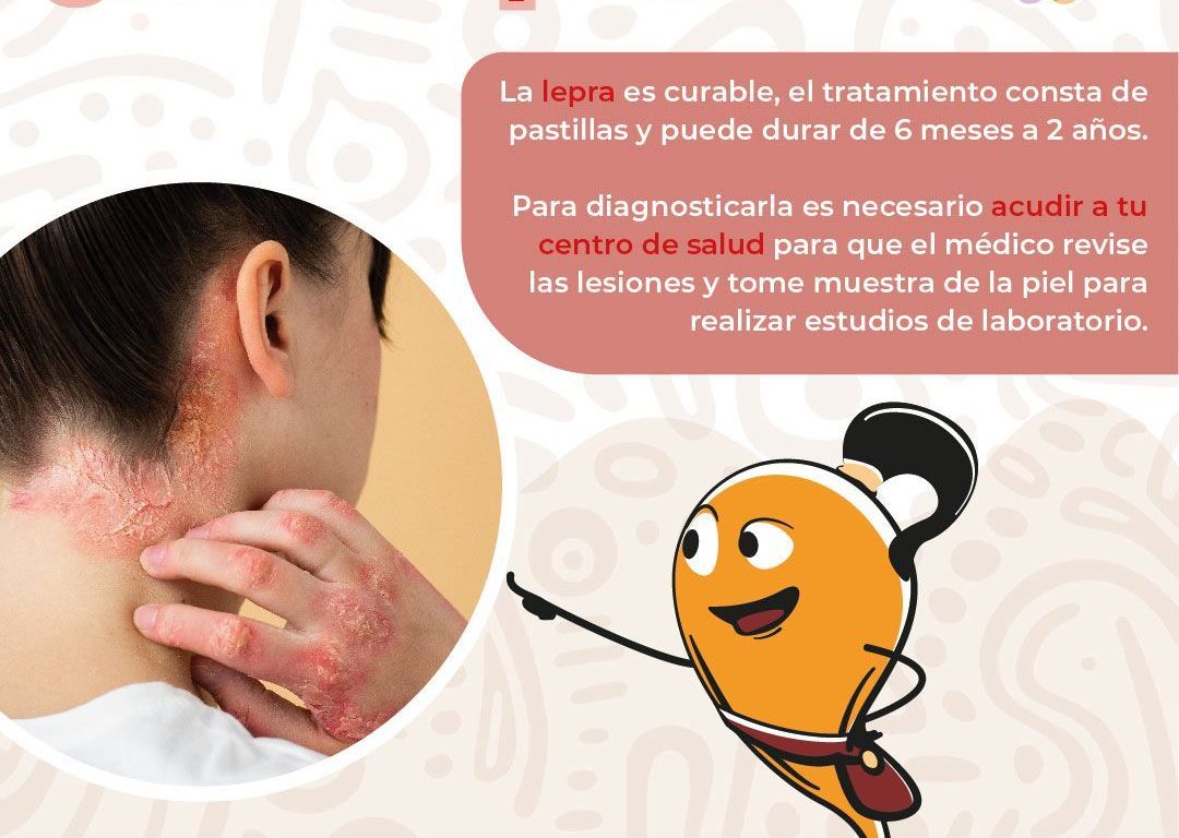 Detalló que este padecimiento daña principalmente la piel, y si no se diagnostica e inicia el tratamiento adecuado y de manera oportuna, puede causar deformidades óseas, discapacidades, lesiones progresivas y permanentes en la piel, los nervios, las extremidades y los ojos. La lepra se caracteriza principalmente por la aparición de manchas descoloridas o café-rojizas en cualquier parte del cuerpo, estas manchas no tienen vello, no sudan y no duelen, si alguna persona presenta estos síntomas, es necesario que acuda de inmediato a su centro de salud. Ahí recibirán valoración, se realizarán los exámenes y pruebas necesarias para confirmar o no Lepra y pueda recibir tratamiento oportuno evitando así complicaciones, la lepra es una enfermedad que aún existe, es curable y el tratamiento es gratuito en los Servicios de Salud