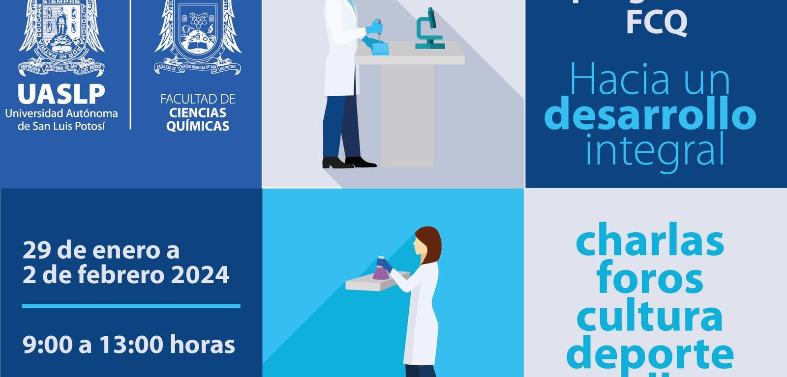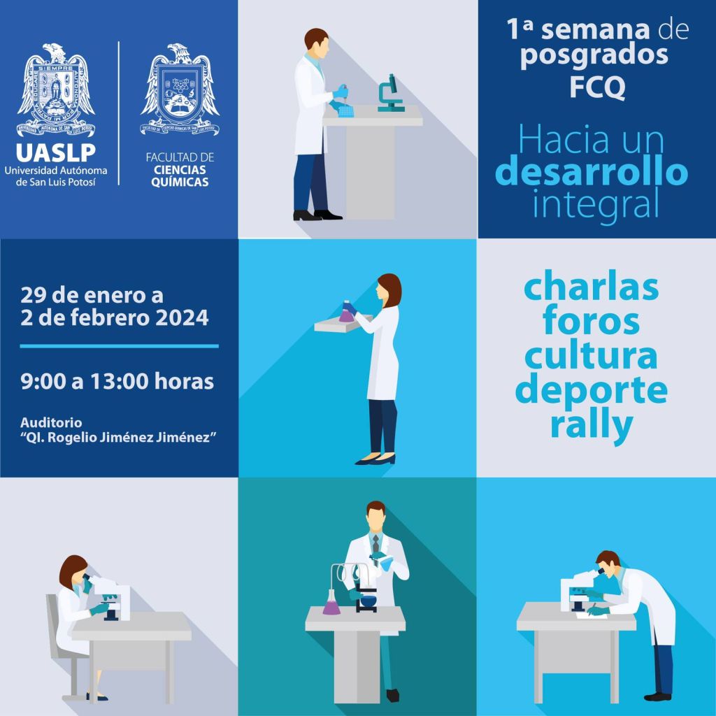 La Facultad de Ciencias Químicas de la Universidad Autónoma de San Luis Potosí, llevará a cabo la 1ª. Semana de Posgrados FCQ, con el lema “Hacia un desarrollo integral”, y que tendrá lugar a partir de este lunes 29 de enero al 02 de febrero de 2024, teniendo como sede el Auditorio “Q.I. Rogelio Jiménez Jiménez” de la Facultad.