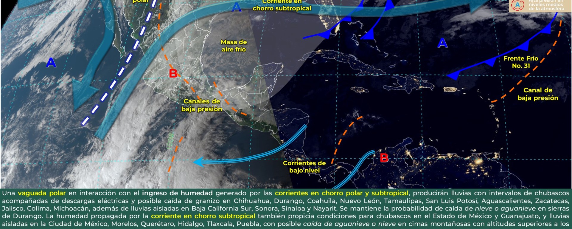 Probabilidad de caída de nieve o aguanieve: zonas montañosas de Baja California, extendiéndose durante la madrugada del viernes hacia Sonora, Chihuahua, Durango, Sinaloa y Zacatecas; así como en cimas superiores a los 4,200 msnm del occidente, centro y oriente del país (Nevado de Colima, Nevado de Toluca, Popocatépetl, Iztaccíhuatl y el Pico de Orizaba), por la mañana.
