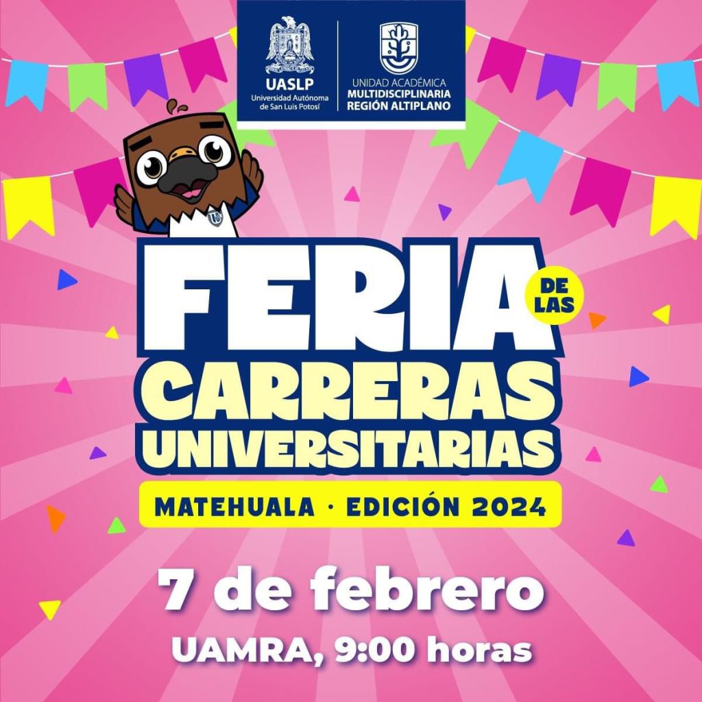 Como parte del proceso de preinscripción 2024-2025, la Universidad Autónoma de San Luis Potosí a través de la Secretaría de Servicios Escolares, lleva a cabo la Feria de las Carreras Universitarias en su edición 2024 en todos sus campos, correspondiendo el 06 de febrero a la Coordinación Académica Región Altiplano Oeste (CARAO) y el 07 de febrero a la Unidad Académica Multidisciplinaria Región Altiplano (UAMRA).