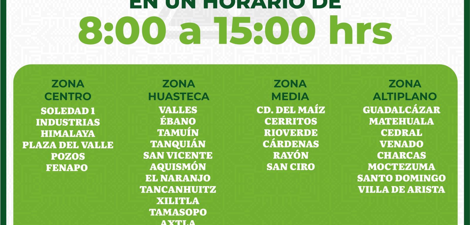 Detalló que en la zona metropolitana brindarán servicios las oficinas de Soledad 1, Industrias, Himalaya, Plaza del Valle, Pozos y Fenapo; en la Huasteca: Ciudad Valles, Ébano, Tamuín, Tanquián, San Vicente, Aquismón, El Naranjo, Tancanhuitz, Xilitla, Tamasopo, Axtla de Terrazas y Tamazunchale; en la región Media brindará servicio las oficinas de Ciudad del Maíz, Cerritos, Rioverde, Cárdenas, Rayón, San Ciro de Acosta y en el Altiplano las de Guadalcázar, Matehuala, Cedral, Venado, Charcas, Moctezuma, Santo Domingo y Villa de Arista.