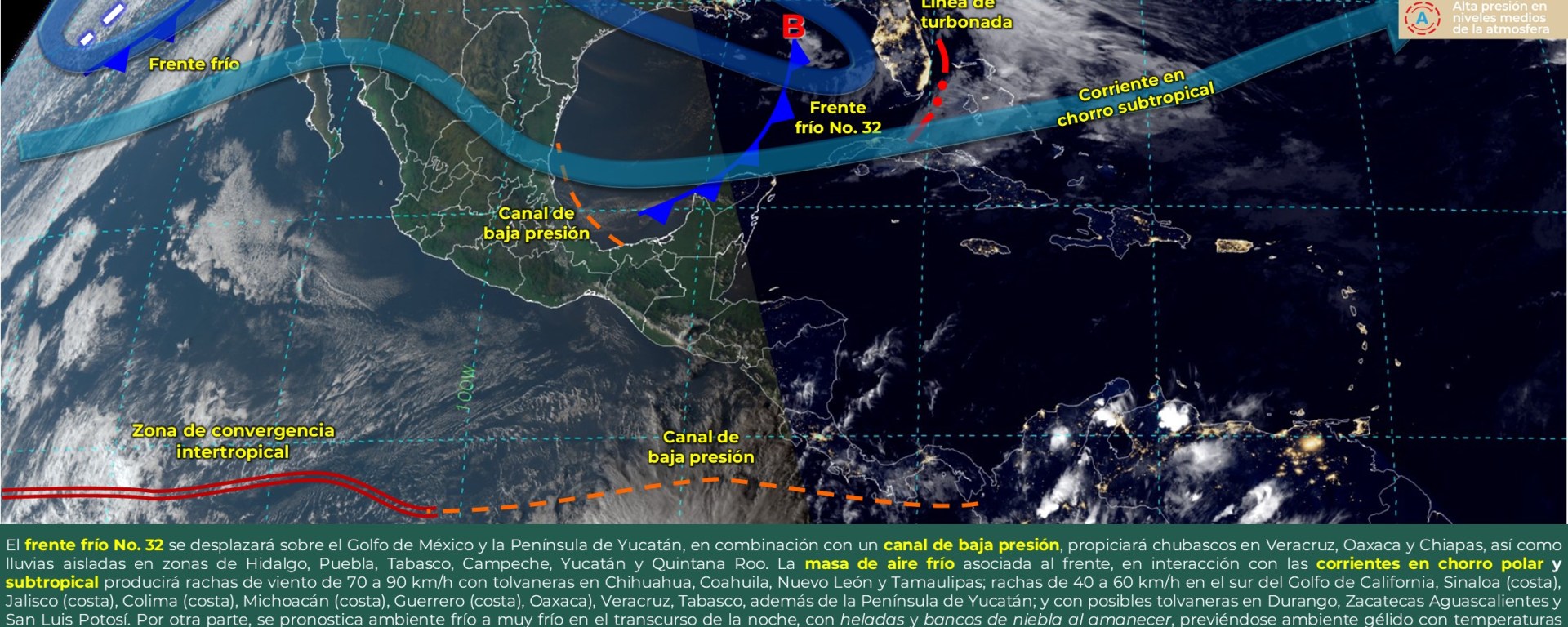 Evento de “Norte” con rachas de viento 80 a 100 km/h: Istmo de Tehuantepec, y con oleaje de 2 a 4 metros de altura: Golfo de Tehuantepec; con rachas de 60 a 80 km/h y oleaje de 2 a 4 metros de altura: costas de Yucatán y Quintana Roo; con rachas de 40 a 60 km/h oleaje de 1 a 3 metros de altura: costas de Tamaulipas, Veracruz, Tabasco y Campeche.