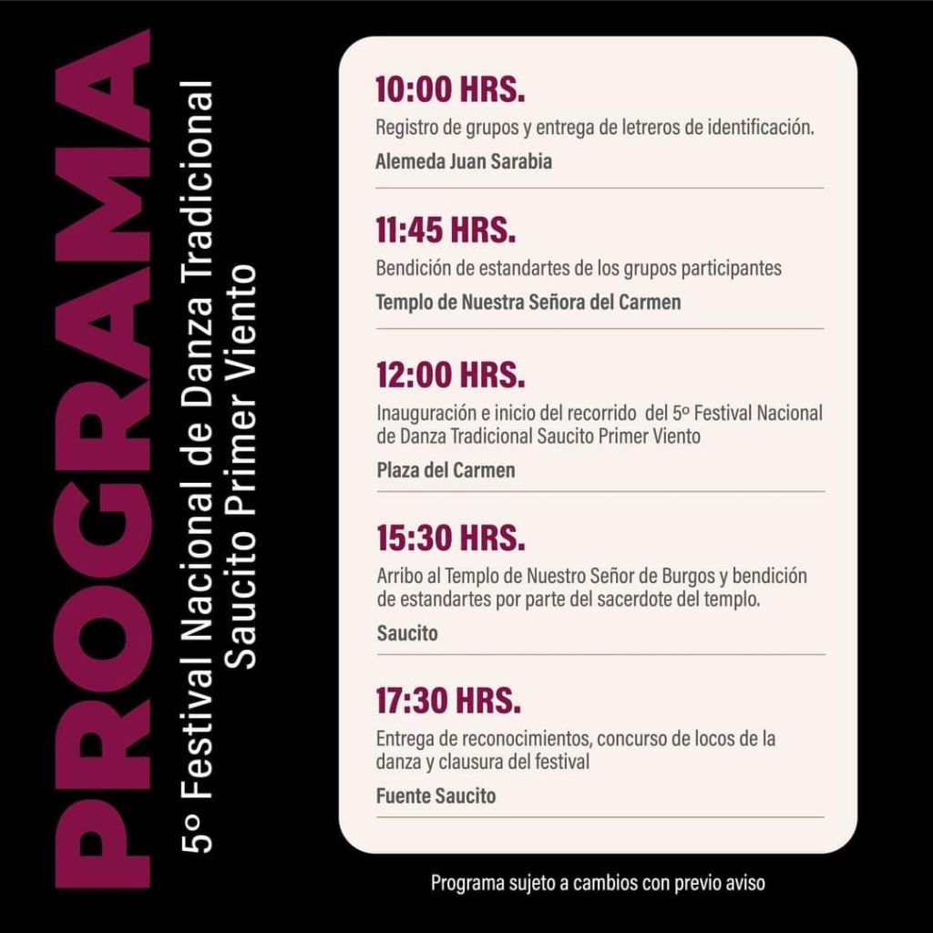 Claudia Peralta detalló que “se trata de la edición número cinco y se realizará el domingo 11 de febrero a partir de las 10:00 horas, comenzando con el registro de grupos y entrega de los letreros de identificación; a las 11:45 horas se realizará la bendición de estandartes de los grupos participantes; a las 12:00 horas iniciará el recorrido teniendo como punto de partida la Plaza del Carmen, recorrerá algunas calles del Centro Histórico para aproximadamente a las 15:30 horas comenzar a recibir al contingente en el Templo del Señor del Saucito, y a las 17:30 horas hacer la entrega de reconocimientos, la realización del concurso de locos de la danza, y clausurar de manera formal este Festival”.