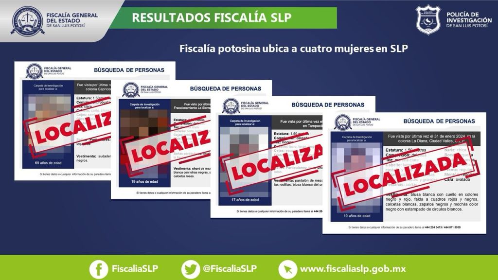 Como resultado de la aplicación del protocolo homologado de búsqueda, la Fiscalía General del Estado de San Luis Potosí (FGESLP) informó que la Dirección General de Métodos de Investigación (DGMI) logró localizar a cuatro mujeres en la demarcación potosina.
