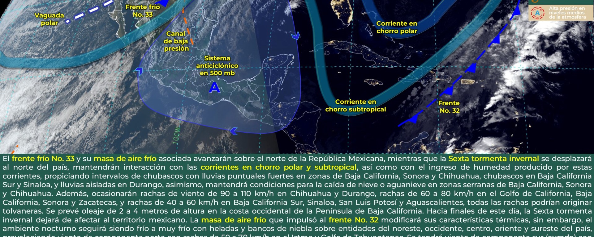 Vientos con rachas de 40 a 60 km/h: Golfo de California y con tolvaneras: Coahuila, Nuevo León, San Luis Potosí, Zacatecas, Aguascalientes, Jalisco, Michoacán, Guanajuato, Querétaro, Hidalgo, Puebla, Tlaxcala, Estado de México y Ciudad de México.
