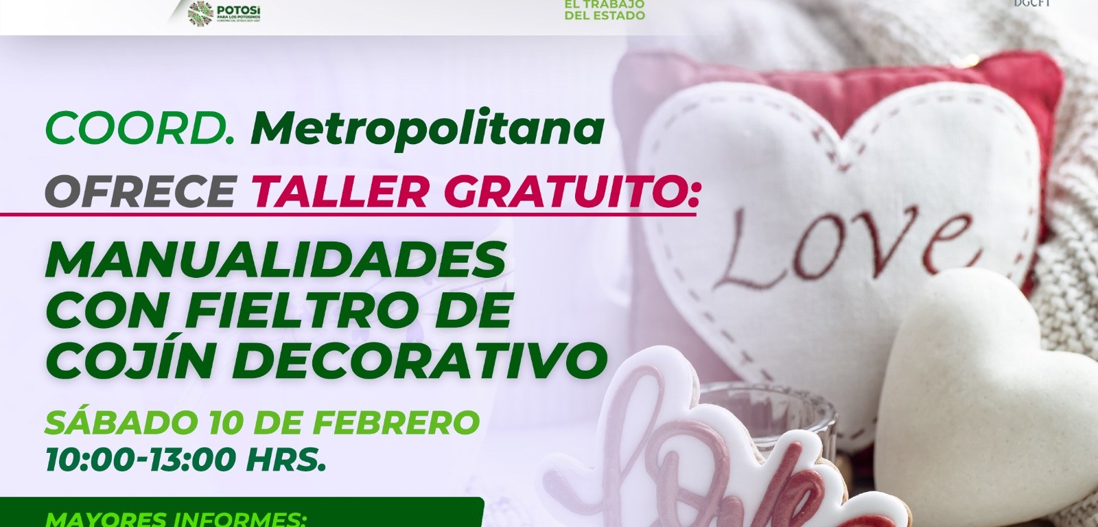 El Gobierno del Estado, a través del Instituto de Capacitación para el Trabajo (Icat), brinda más apoyo a las y los potosinos para que puedan autoemplearse con el taller gratuito de manualidades con fieltro “Cojín decorativo” que se realizará este sábado 10 de febrero en punto de las 10:00 de la mañana en la coordinación metropolitana, ubicada en Mariano Arista #340 en la zona centro de la ciudad.
