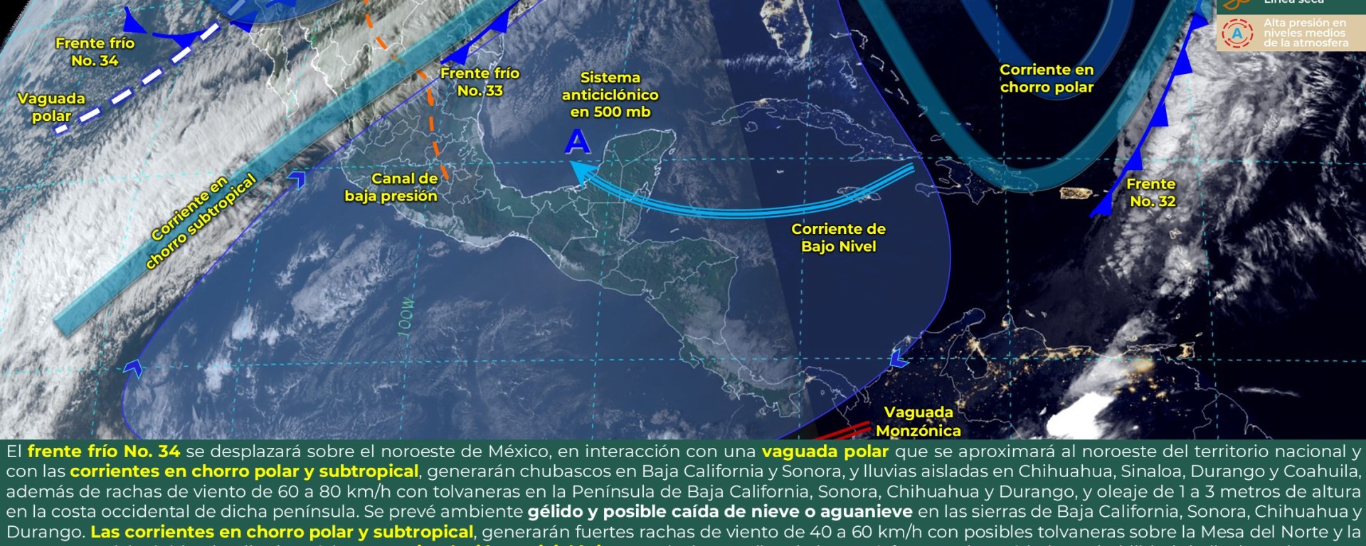 Posible caída de nieve o aguanieve: zonas de Baja California, Sonora, Chihuahua, Sinaloa (norte) y Durango.