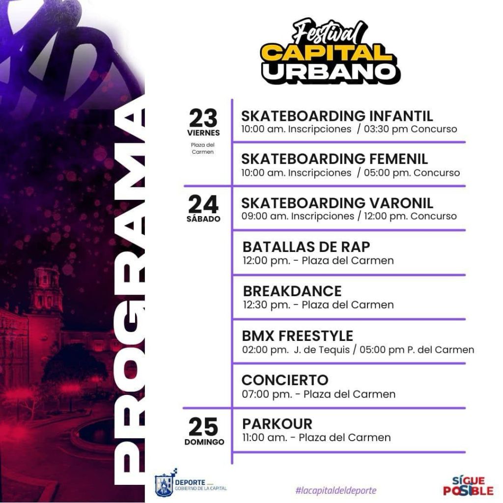 Para el sábado 24 del presente se realizará el skateboarding varonil a las 12:00 del mediodía con los previos registros desde las 10:00 de la mañana. También el sábado 24 se contará con las tan esperadas “batallas de rap” con sede en la Plaza del Carmen donde las acciones inician a las 12:00 del mediodía.