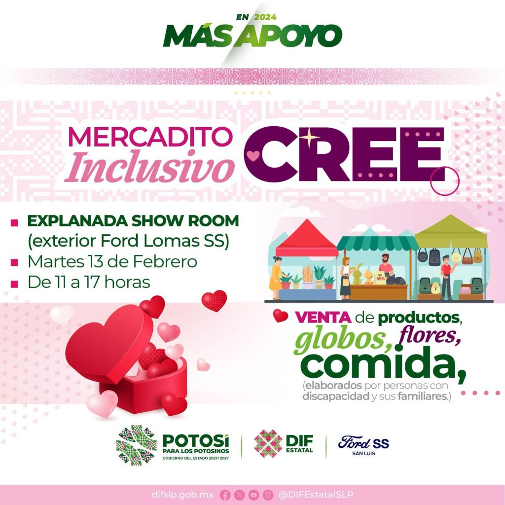En sintonía con la visión sensible y humanitaria del Gobernador Ricardo Gallardo Cardona y de la presidenta honoraria del DIF, Ruth González Silva, el Centro de Rehabilitación y Educación Especial (CREE), concretó las gestiones correspondientes para la celebración del Mercadito Inclusivo del Amor y la Amistad.