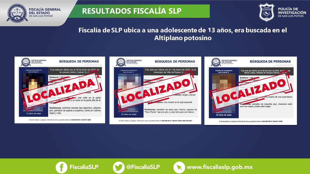 La Fiscalía General del Estado de San Luis Potosí (FGESLP) informó que a través de las acciones de la Policía de Investigación (PDI), consiguió ubicar a tres personas en la Entidad.