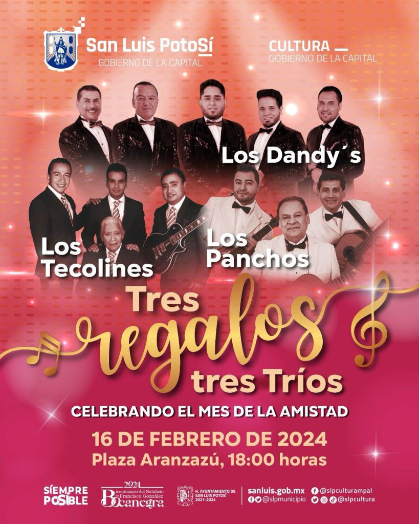 Daniel García Álvarez de la Llera, Director de Cultura Municipal dijo que el evento se ha denominado “Tres regalos tres Tríos”, con el que el Ayuntamiento de San Luis Potosí celebra el amor y la amistad, con un concierto del gusto de los adultos y adultos mayores, aunque también gusta a las nuevas generaciones.