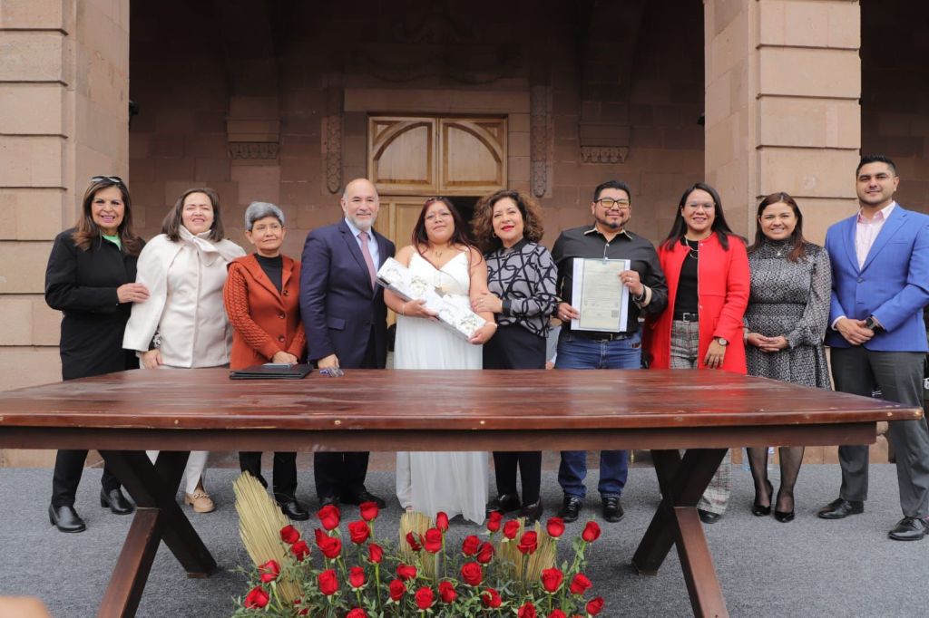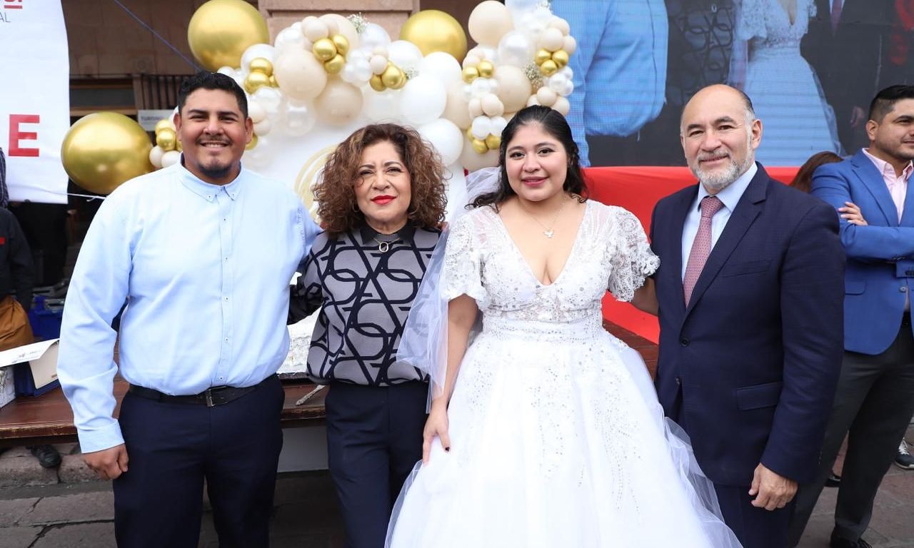 La ceremonia tuvo como marco, la explanada de la Plaza de Armas, frente al Palacio Municipal, donde se dieron cita las parejas que decidieron dar el siguiente paso y formalizar su situación. Tomadas de la mano y con sus mejores atuendos y ramo de flores en mano, esperaron el turno para recibir su Acta de Matrimonio, hubo parejas que fueron acompañadas de sus hijos e hijas. Los nuevos esposos, emocionados celebraron este acto, se tomaron fotografías para finalmente compartir pastel y recibir un obsequio de parte del Alcalde Enrique Galindo y la Presidenta del DIF Municipal, Estela Arriaga Márquez.