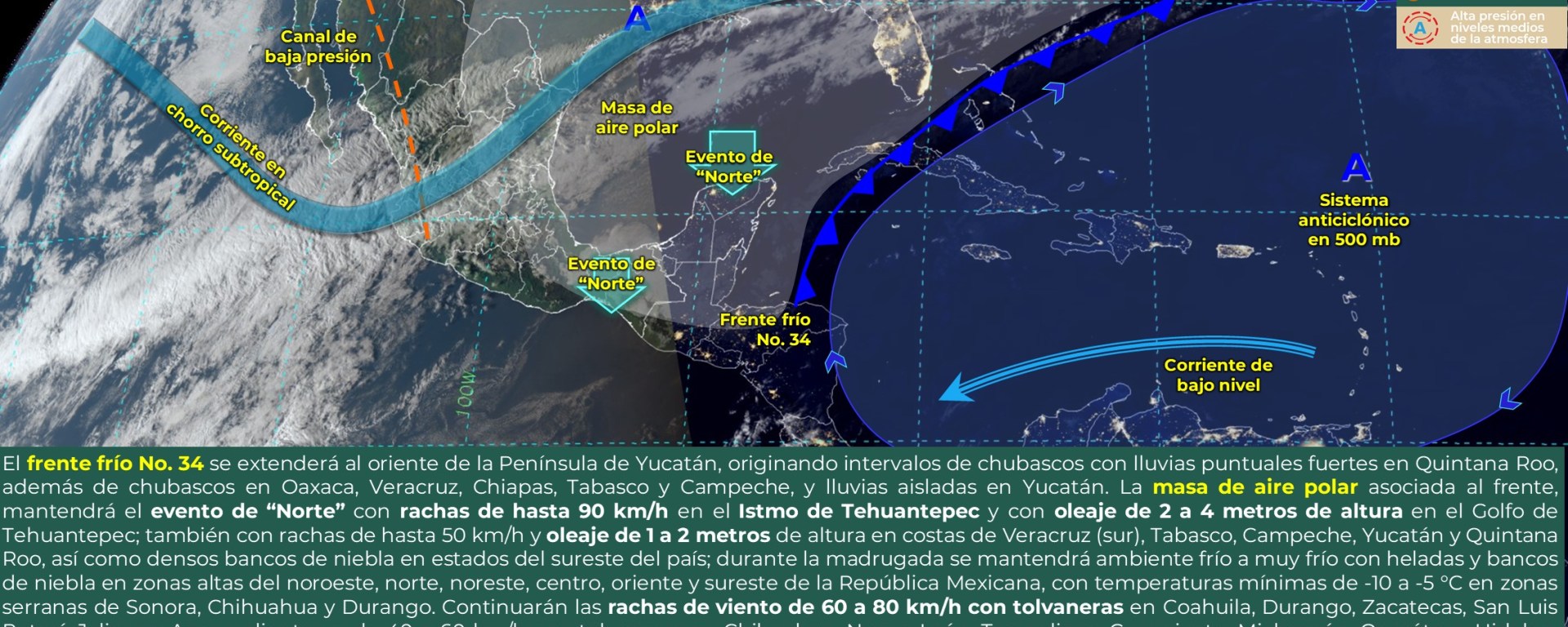 Viento de componente norte con rachas de 60 a 80 km/h: Istmo de Tehuantepec; y con oleaje de 1 a 3 metros de altura: Golfo de Tehuantepec.