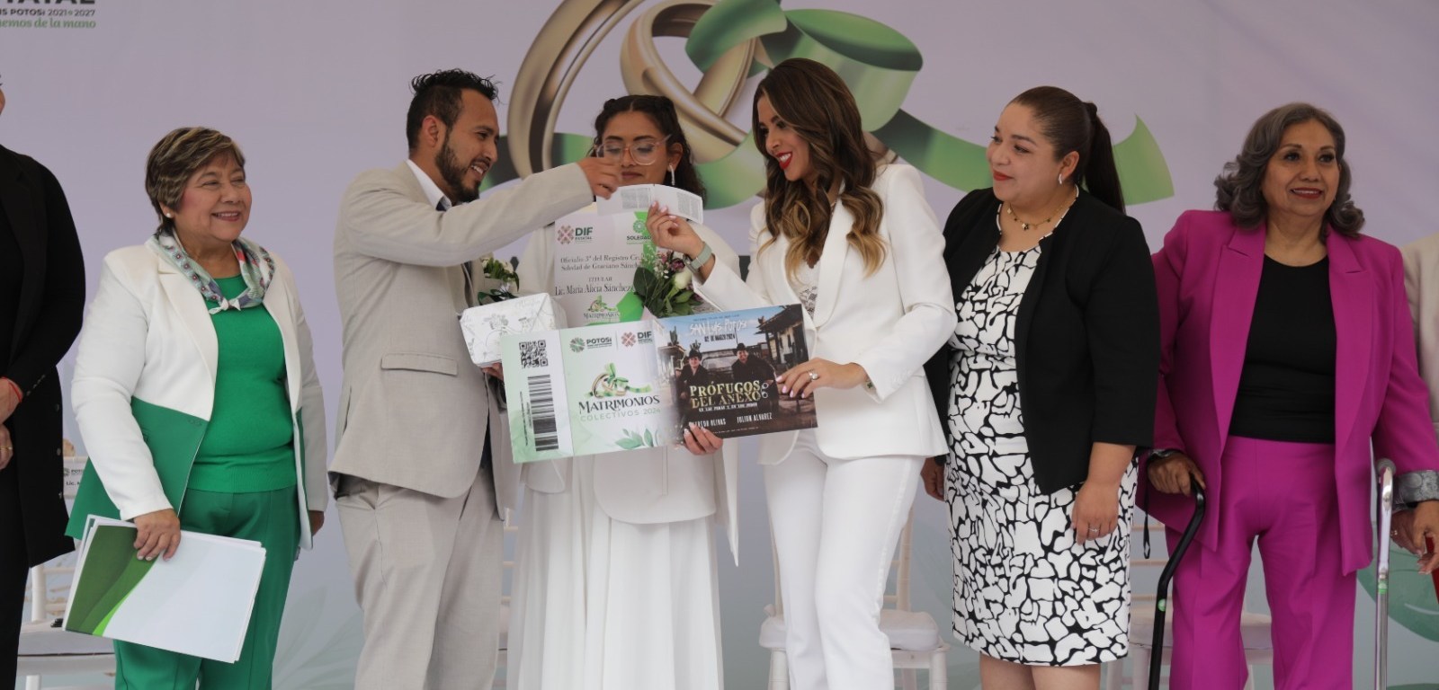 Las y los contrayentes recibieron como regalo de bodas por parte del Gobernador Ricardo Gallardo Cardona, boletos para acudir este 2 de marzo al concierto de Prófugos del Anexo