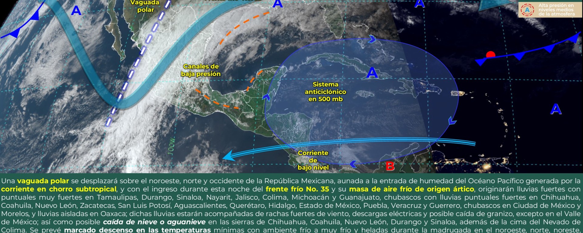 Posible caída de nieve o aguanieve: zonas altas de Chihuahua, Coahuila, Nuevo León, Tamaulipas, Durango, Zacatecas, San Luis Potosí, Michoacán, Guanajuato, Querétaro, Hidalgo, Estado de México, Ciudad de México, Morelos, Tlaxcala, Puebla y Veracruz.