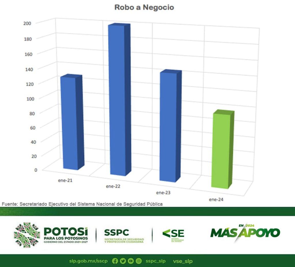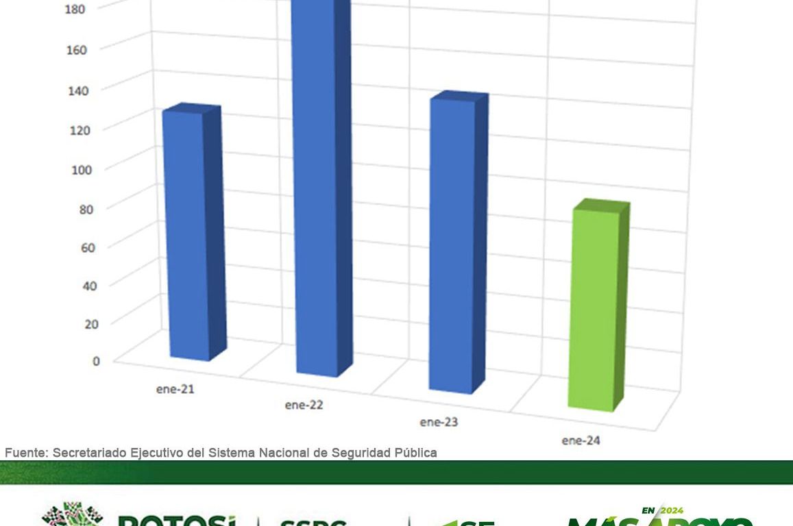 En enero el 2024 en San Luis Potosí no hubo feminicidios ni secuestros; además, disminuyeron un 47.5 por ciento los homicidios; 68 por ciento los homicidios dolosos; robo de autopartes y en transporte público 67 por ciento y un 53 por ciento el robo a autotransportes, esto comparado con las cifras obtenidas en el arranque anual de los últimos tres años.