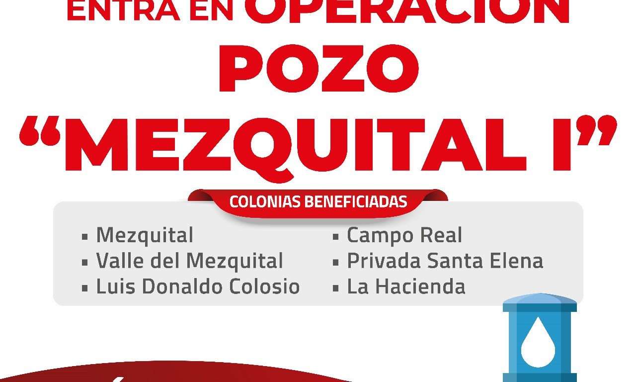 El “Mezquital I” abastece de agua a las colonias Mezquital, Valle del Mezquital, Luis Donaldo Colosio, Campo Real, Privada Santa Elena y La Hacienda.