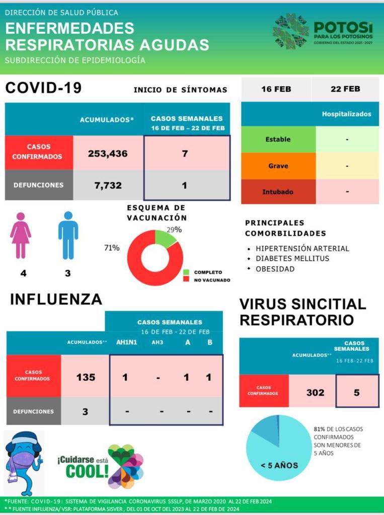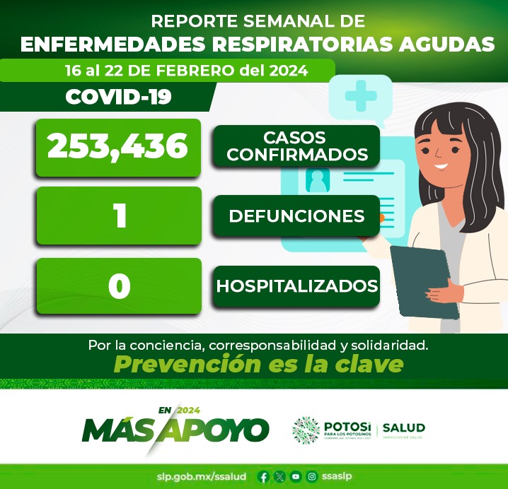 El Gobierno de San Luis Potosí a través de los Servicios de Salud estará presentando el informe sobre Covid 19 de forma semanal, informando cada viernes de los casos que se registraron durante la semana y se completará con información sobre enfermedades respiratorias como son influenza y virus sincitial respiratorio.