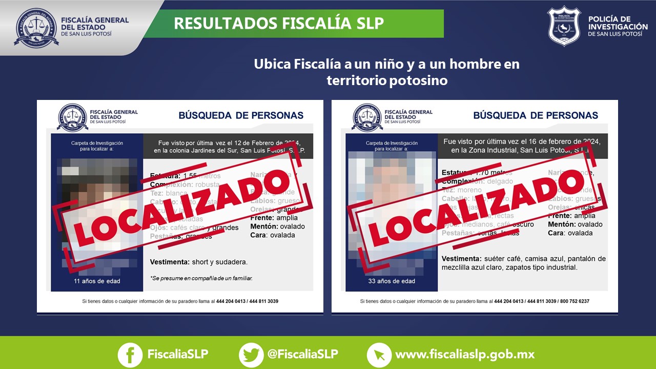 La Fiscalía General del Estado de San Luis Potosí (FGESLP) informó que, a través de las acciones de la Policía de Investigación (PDI), consiguió ubicar a dos personas en la Entidad.