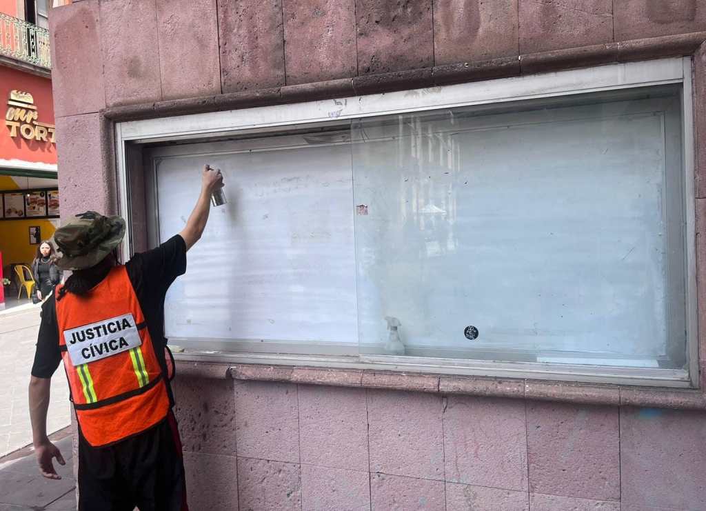 Bajo el nuevo modelo de Justicia Cívica implementado por la Secretaría de Seguridad y Protección Ciudadana (SSPC) este sábado una persona infractora al Bando de Policía y Gobierno cumplió con la sanción impuesta por el Juez Cívico de realizar la reparación del daño luego de ser detectado por agentes municipales realizando pintas con un crayón industrial en una cartelera de un comercio ubicado en el pasaje Zaragoza y la calle Guerrero en el Centro Histórico.